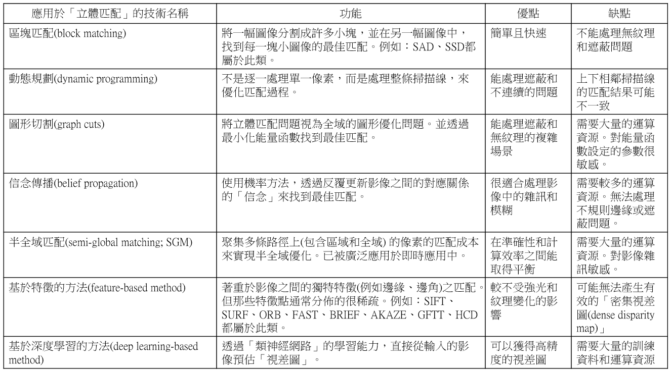表1 應用於立體匹配的技術種類和優缺點之比較