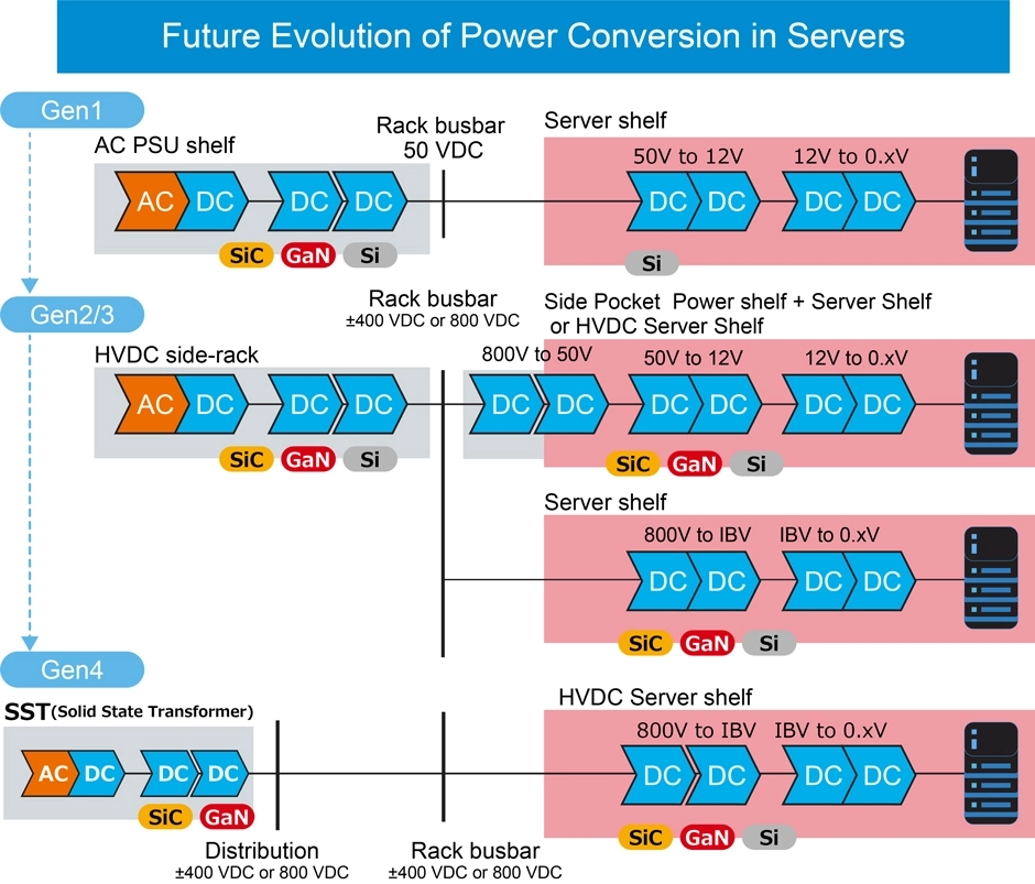 部分廠商如ROHM正積極研發下一代伺服器的解決方案,除了利用EcoSiC、EcoGaN與EcoMOS等現有產品(如SiC/GaN/Si IGBT、隔離型閘極驅動器、冷卻風扇驅動器、SSD用PMIC、HDD用複合馬達驅動器)外,亦規劃開發大電流LV MOS、隔離型DC-DC、SoC/GPU用DC-DC、eFuse等產品。