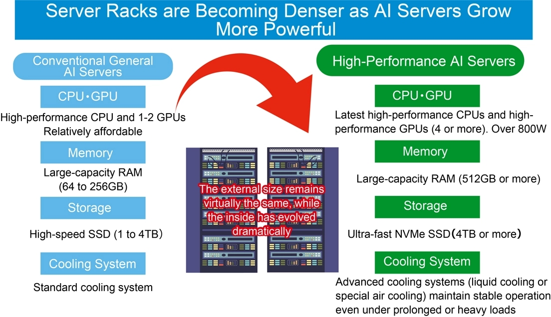 AI伺服器比通用伺服器處理的資料量更大,需運轉高效能GPU、大容量記憶體及高效能軟體。因此耗電量更多,散熱與冷卻也更為重要。
